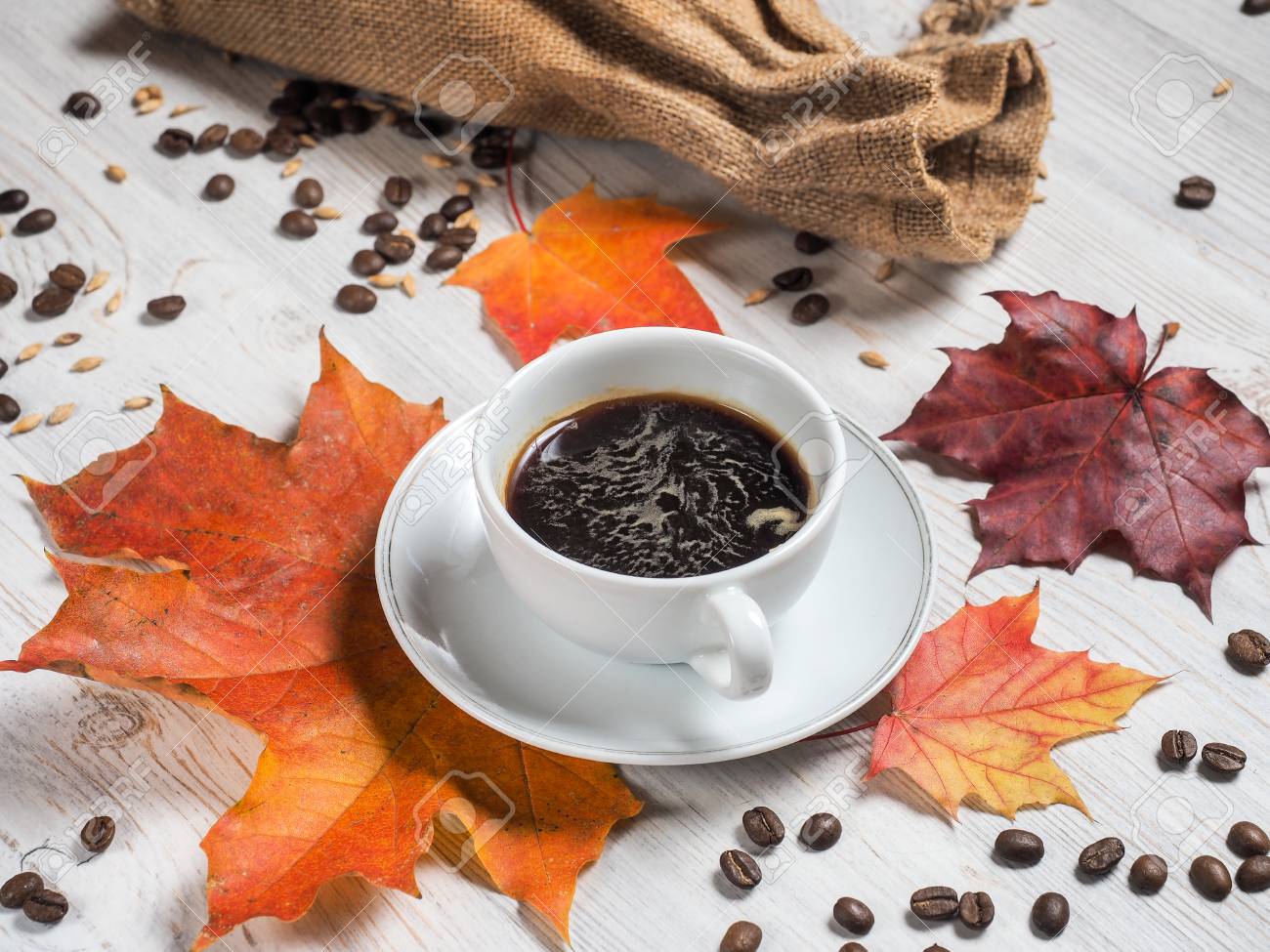 Autumn Autumn Leaves Maple Hot Cup Coffee Beans On The Background Of Wooden Table Seasonal Morning Coffee Sunday Rest And The Concept Of Still Life Stock Photo Picture And Royalty Free Image